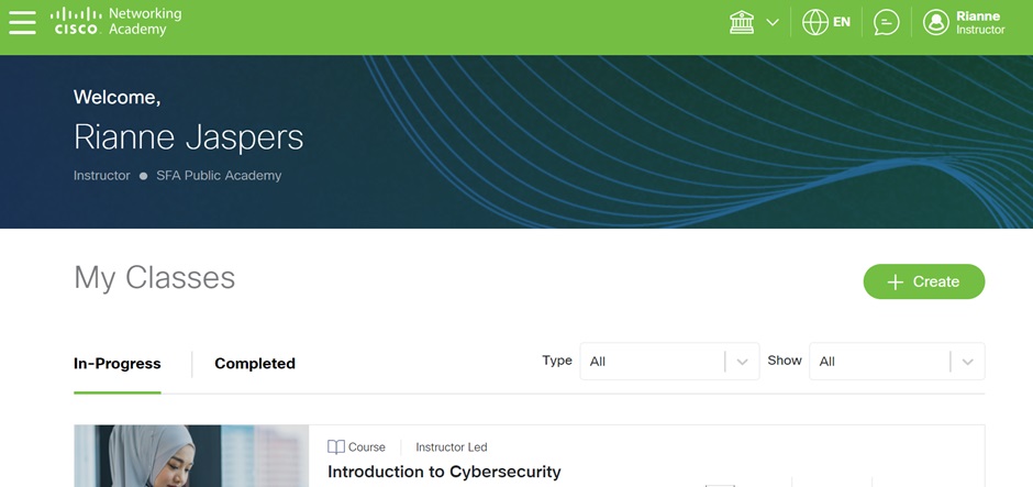 Stap 6. Volg de stappen om een klas te starten. Inleiding van Cybersecurity (NL) is momenteel (juni 2023) alleen Self Paced beschikbaar. Instructor led heeft meer faciliteiten voor een docent in de vorm van klassenmanagement en een docentendashboard.
